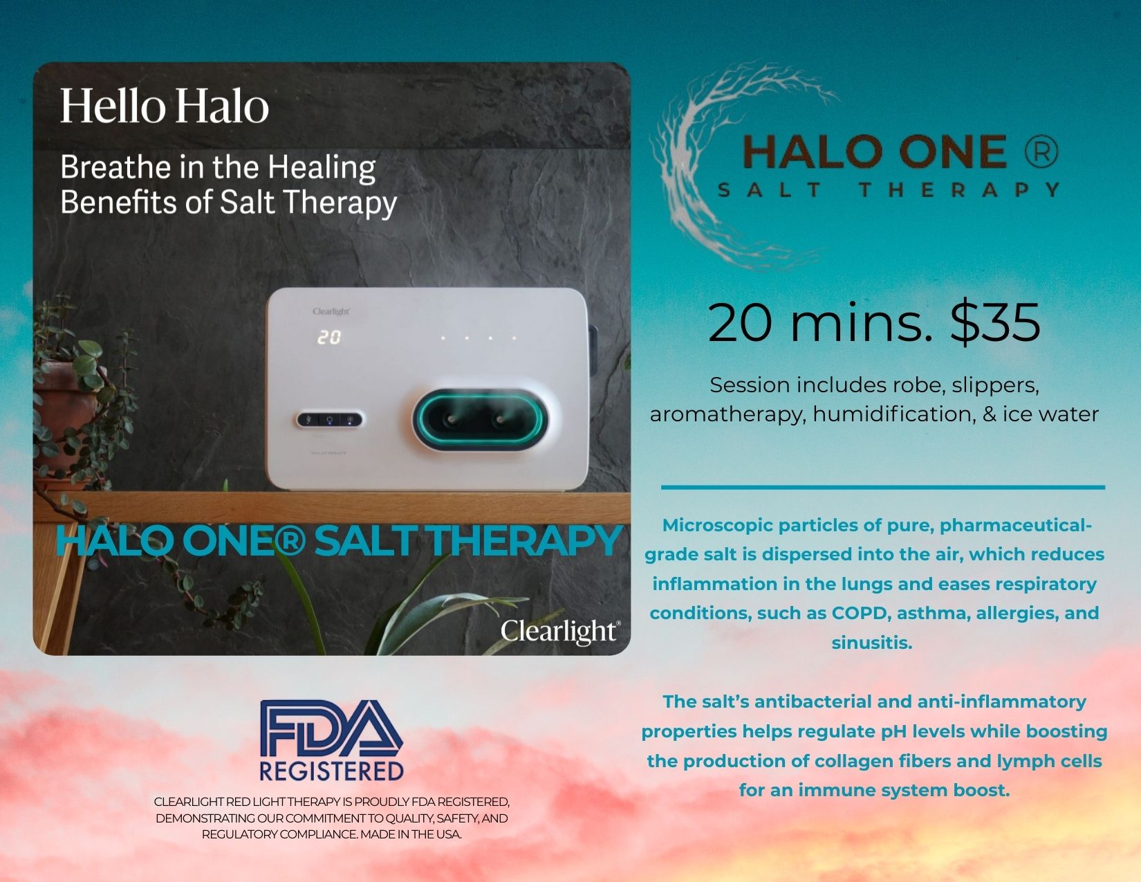 Halo Salt Therapy is a natural, holistic method to supporting your body’s natural healing process. Microscopic particles of pure, 99.99% pure sodium chloride (pharmaceutical-grade salt) salt is dispersed into the air, which reduces inflammation in the lungs and eases respiratory conditions, such as COPD, asthma, allergies, and sinusitis. The salt’s antibacterial and anti-inflammatory properties promote clearer skin and reduces irritation from eczema or acne. Clearlight Halo Salt Therapy is FDA Registered, demonstrating commitment to quality, safety, and regulatory compliance. Clearlight products are made in the USA and accredited by the BBB with an A+ Rating.
